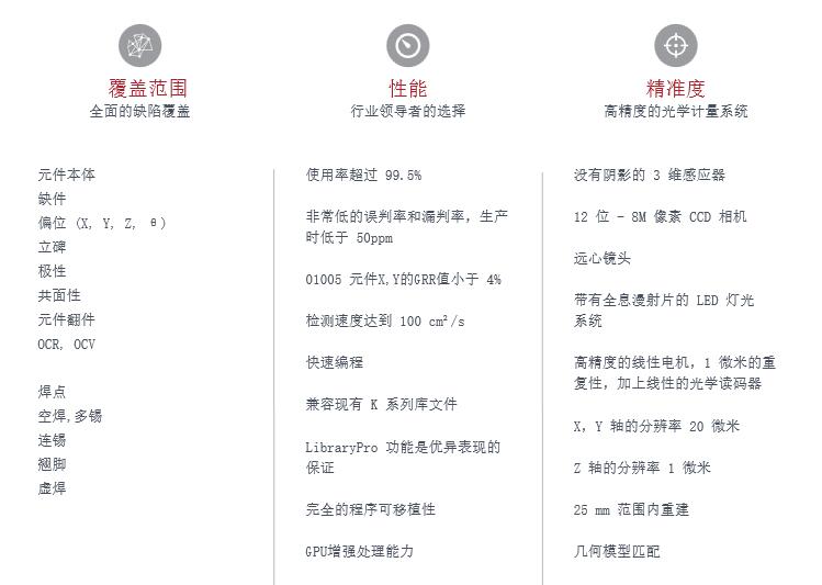 VI 5K 3D AOI 光學(xué)檢測機(jī) 使用率超過99.5% 檢測速度達(dá)到100cm2/s 快速編程 LibraryPro 功能是優(yōu)異表現(xiàn)的保證 完全的程序可移植性 幾何模型匹配