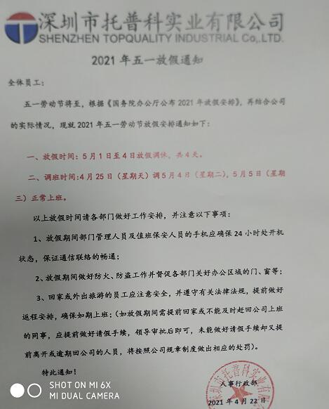 現(xiàn)將深圳托普科實(shí)業(yè)五一放假通知公布如下: