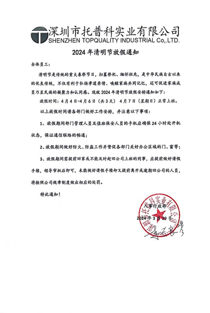 清明節(jié)放假時(shí)間:根據(jù)公司實(shí)際情況,我公司清明放假時(shí)間為2024年4月4日--2024年4月6日(周四、周五、周六)共3天,2024年4月7日(周日)正常上班。