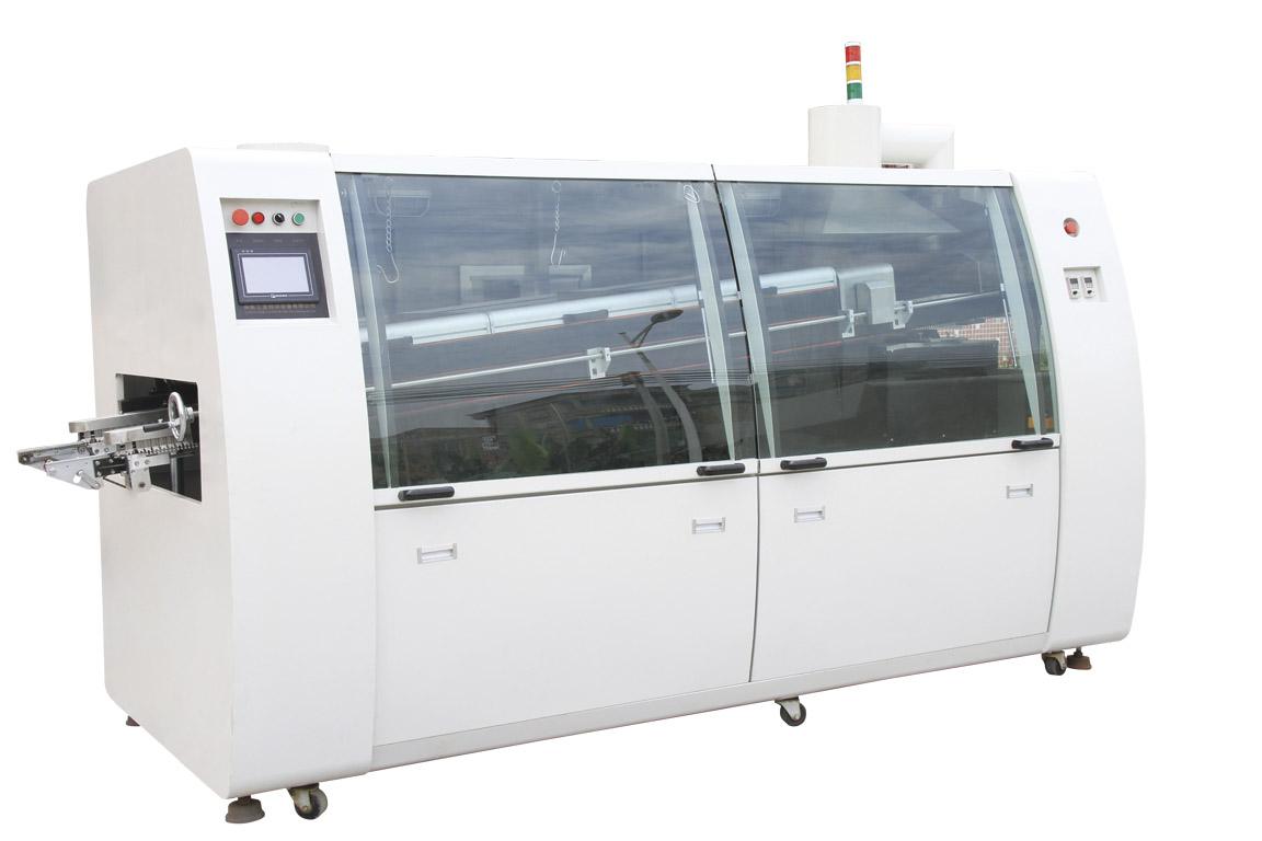 將熔化的軟釬焊料(鉛錫合金),經電動泵或電磁泵噴流成設計要求的焊料波,使預先裝有元器件的印制板通過焊料波,實現(xiàn)元器件焊端或引腳與印制板焊盤間機械與電氣連接的軟釬焊。波峰焊機主要是由運輸帶,助焊劑添加區(qū),預熱區(qū)和波錫爐組成,其主要材料是焊錫條